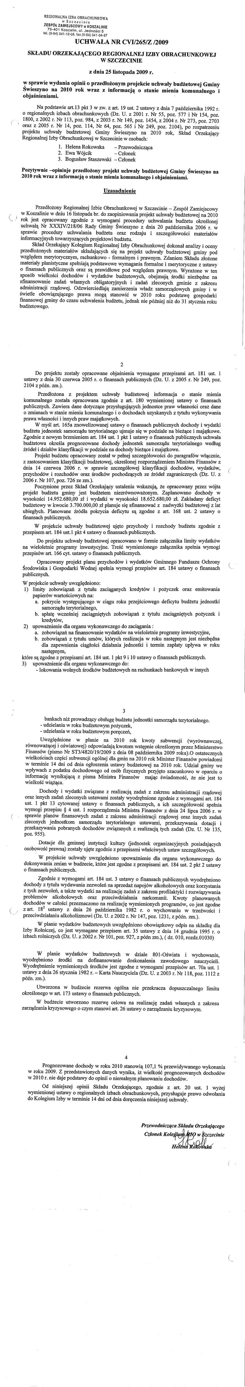 Uchwała RIO Szczecin w sprawie opini o przedłożonym projekcie uchwały budżetowej Gminy Świeszyno na 2010 rok wraz z informacją o stanie mienia komunalnego i objaśnieniami